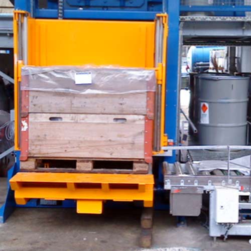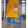 Palettenboxen werden durch seitlich einschwenkbare Niederhalter festgehalten, so das nur der Inhalt in den Zerkleinerer fällt.